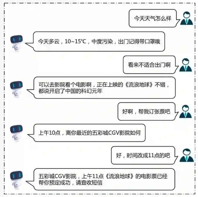 人机对话(Human-Machine Conversation)是指让机器理解和运用自然语言实现人机通信的技术,如下图所示。通过人机对话交互,用户可以查询信息,如示例中的第一轮对话,用户查询天气信息;用户也可以和机器进行聊天,如示例中的第二轮对话;用户还可以获取特定服务,如示例中的最后两轮对话,用户获取了电影票预定服务。