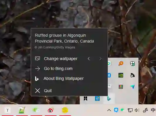 如果你什么都不操作,Bing 壁纸客户端会每天定时下载最新的 Bing 壁纸并将其设置为当日的电脑桌面背景。当然这个小工具还提供了一些「扩展功能」,比如在系统托盘找到应用并打开右键菜单,你可以看到当日的壁纸的相关信息介绍,点击就会打开浏览器跳转到对应的搜索结果页。