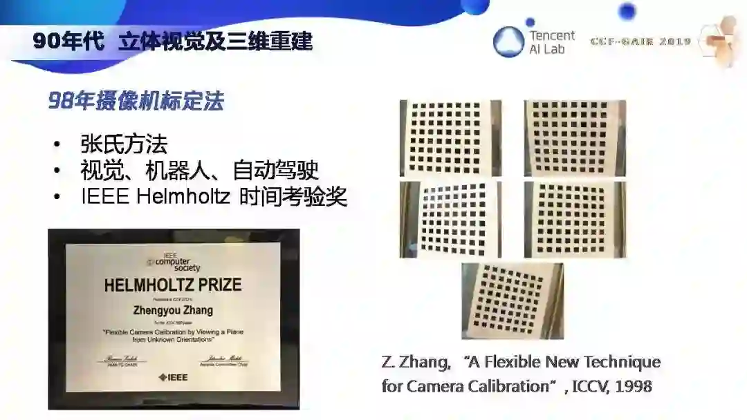 1998 年我提出了一个新的摄像机标定法,后来大家都称它为「张氏方法」,现在它已经在全世界的三维视觉、机器人、自动驾驶上普遍应用,也获得了IEEE Helmholtz 时间考验奖。