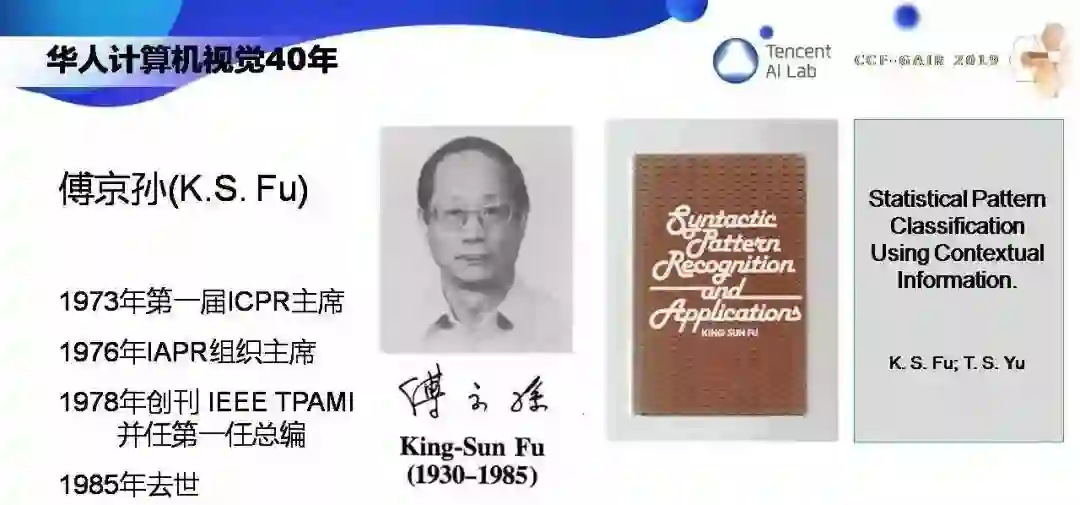 这里需要提到一个关键性的人物,那就是普渡大学的傅京孙教授,他是模式识别领域的鼻祖。他是 1973 年第一届 ICPR 的主席,1976 年创建了 IAPR,1978 年创刊了 IEEE TPAMI,并担任第一届主编。本来他是支持 1988 年 ICPR 在中国召开的,但不幸的是 1985 年他去世了,所以 1988 年的申请没有成功。如果 1988 年 ICPR 能在中国召开,也许中国在模式识别和计算机视觉上的发展会更提前。当然历史没有如果。ICPR 在中国的召开等到了三十年以后,2018 年在谭铁牛院士的带领下,ICPR 第一次在中国召开。
