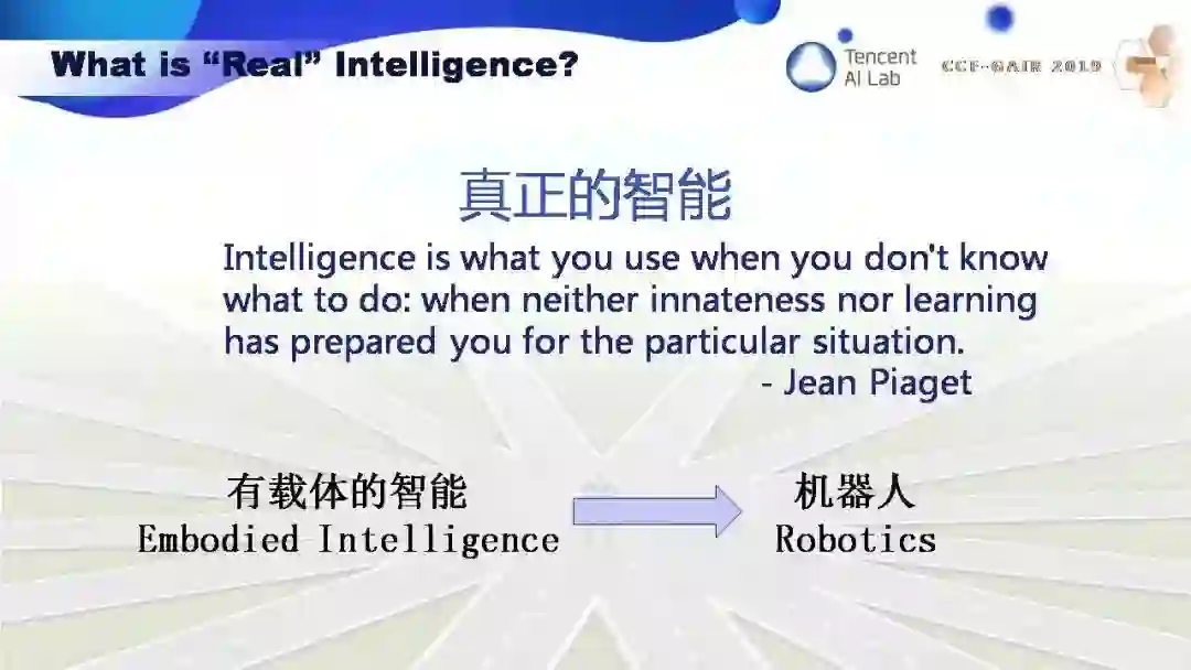 什么是真正的智能?我想目前还没有定论,而且我们对我们自己的智能还没有足够的了解。不过我很认同瑞士认知科学家 Jean Piaget 说的,智能是当你不知道如何做的时候你用的东西。我认为这个定义是非常有道理的。当你无法用你学到的东西或天赋去面对时,你动用的东西就是智能。如何去实现有智能的系统呢?可能有很多条路,但我认为一条很重要的路是需要把载体考虑进去,做有载体的智能,也就是机器人。
