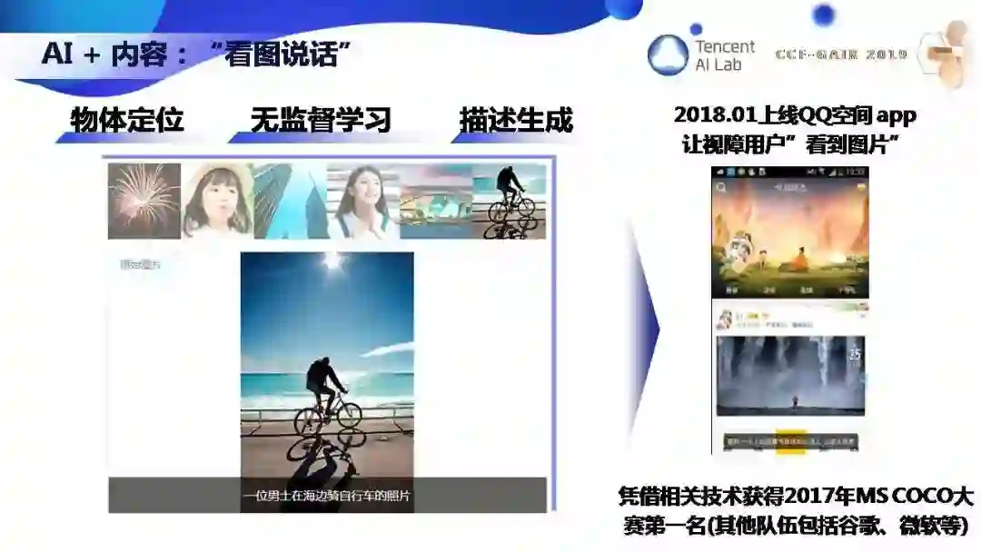 我们腾讯 AI Lab 在这方面也开始做了一点点工作。比如我们的看图说话项目能够用语言描述一张照片的内容,2018 年 1 月,我们上线 QQ 空间 app 让视障用户「看到」图片。