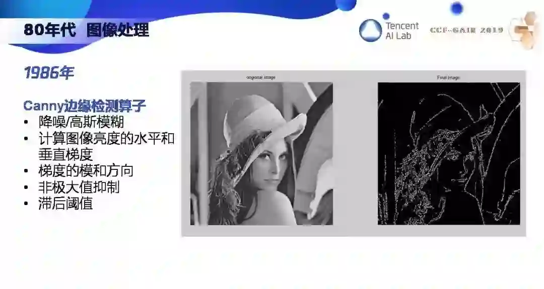 那时候还有一个比较有名的工作是华人科学家沈俊做的,他那时在法国波尔多大学。他比较了不同的算子。他的算子在有些图像方面要比 Canny 检测器要好。所以到了八十年代中叶,当我留学法国的时候,图像处理已经做的差不多了。