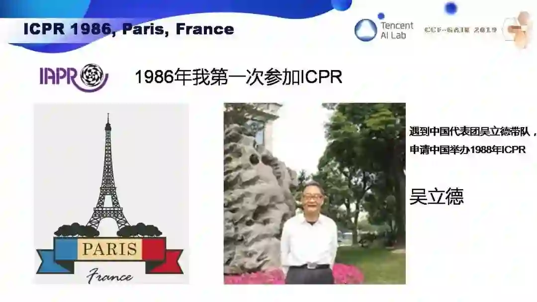 1986 年其实发生了很多事情,1986 年是我第一次参加国际会议,是在巴黎召开的 ICPR(世界模式识别大会)。在这次大会上,我碰到了复旦大学的吴立德教授,他带领了一支中国的代表团,并在会上做了一场大会报告,介绍了中国在模式识别上的研究现状,他们准备申请 1988 年的 ICPR 在中国召开。