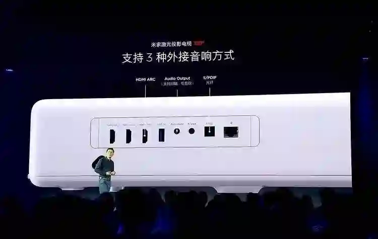 接口方面,米家激光投影电视和主流产品差不多,如果对内置的声音效果不满意,还可以通过 3 种方式连接外置的音响。