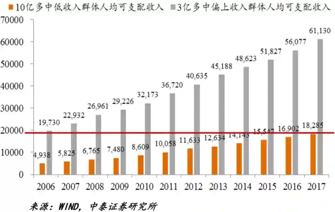 李迅雷最新的观点更是把中国分为两层——10亿人的中国和3亿人的中国,10亿多人是中低收入群体;3亿多人是中偏上收入群体。中等偏上收入群体为3.25亿人,2017年对应人均年可支配收入为6.1万元,2018年对应人均年可支配收入为7.06万元。而中低收入群体,至今未到2万元,差距越拉越大。