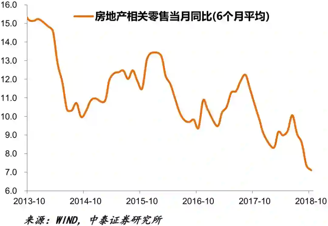 5月11日,中泰证券首席经济学家李迅雷发表文章认为,有数据显示,影响消费的并不是“六个钱包”,而是房价增速放缓。社会消费品零售额的增速与房价及销量增速正相关。他的论据之一是“房地产相关零售同比”、“家电”、“家具”、“建筑装潢”等曲线呈现的趋势。
