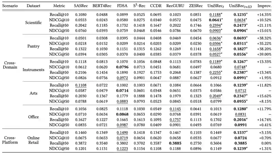 前言:当前对序列推荐的研究集中于开发更高效的序列表示学习(SRL)模型。大部分已有方法都是显示地对商品 ID 进行序列建模,然而这些模型难以迁移至新的推荐场景,如新的领域或平台。为了解决建模商品 ID 带来的限制,本文提出了一个新的 SRL 方法 UniSRec。具体的,UniSRec 利用商品的文本信息学习可迁移至不同推荐场景的通用表示。为了学习通用商品表示,我们设计了基于参数白化和混合专家网络(MoE)增强的商品编码架构;为了学习通用序列表示,我们设计了两种基于对比学习的优化目标,在预训练阶段采样多个领域的序列/商品作为负例。预训练后的通用序列表示模型可以参数高效地迁移至新的领域或平台中。在真实数据集上构建的大量实验验证了 UniSRec 的效果。特别的,当把 Amazon 数据集上预训练的 UniSRec 模型迁移至一个新平台(某英国电商)时,也可以观察到效果提升,验证了本文提出的通用序列表示学习方法的强大迁移性。