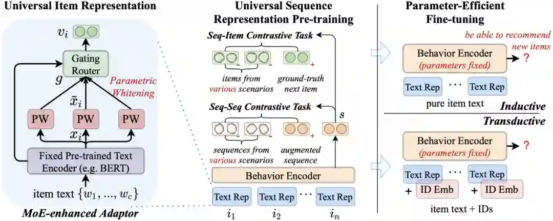 我们的做法是基于商品文本学习可迁移的商品表示,是通过自然语言描述了商品的特性。越来越多的证据显示,自然语言提供了一个通用的数据格式,可以连接不同的任务和领域。受此启发,我们首先使用预训练语言模型(PLM)学习文本表征。进一步,由于不同领域的文本表征可能会形成不同的语义空间(即使文本编码器相同),我们提出使用参数白化网络和混合专家网络(MoE)增强的适配器模块来将原始的文本表示转换至适用于推荐任务的通用的语义空间。
