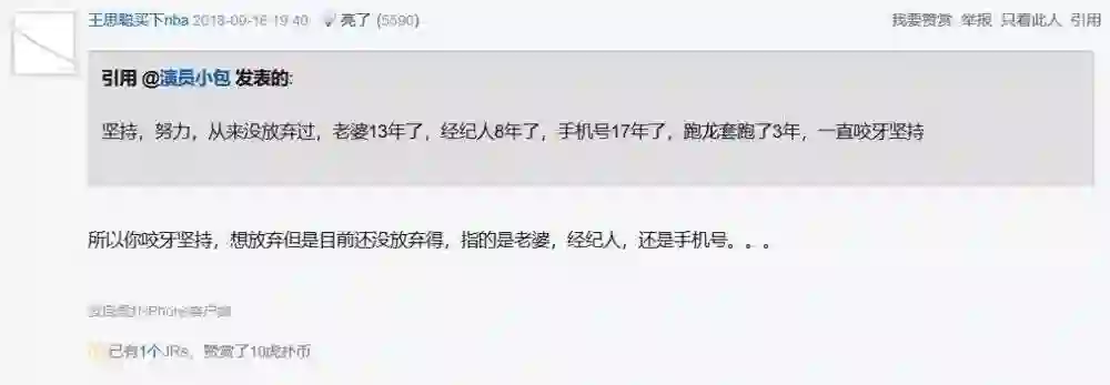 2018年9月16日包贝尔注册低调的ID“演员小包”空降虎扑步行街与网友进行互动,可虎扑的网友对包贝尔的到来并不友好:“直言不想看”。无奈的包贝尔开始“熬鸡汤”打感情牌:“坚持,努力,从来没放弃过,老婆13年了,经纪人8年了,手机号17年了,跑龙套跑了3年,一直咬牙坚持”。事与愿违,虎扑网友继续diss:“所以你咬牙坚持,想放弃但是目前还没有放得,指的是老婆、经纪人还是手机号?”