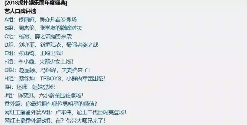 值得注意的是,2018年虎扑步行街关于娱乐圈的票选活动相比往年数量要多,涉及的种类也更加丰富。上文提到的2018年虎扑娱乐圈年度盛典艺人评选绝不仅限于最不受欢迎男艺人,该评选涵盖了最受欢迎男、女艺人;最不受欢迎男、女艺人;年轻男、女艺人口碑榜;虎扑争议最大男、女艺人;虎扑娱乐圈情侣口碑榜单;网红男、女主播。