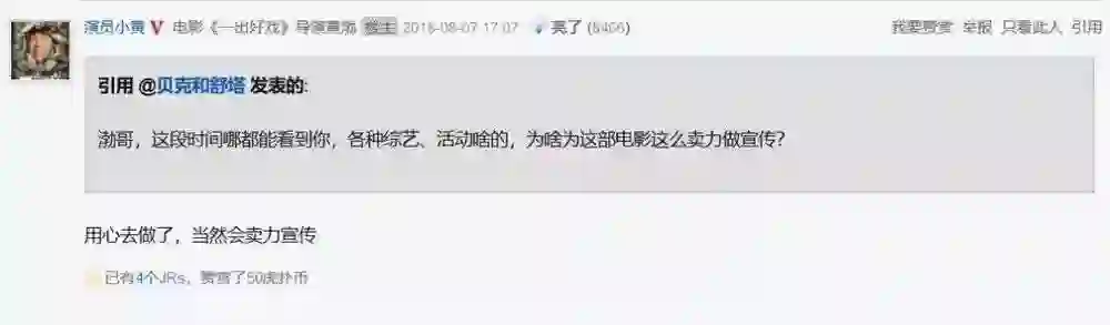 2018年8月7日,演员黄渤到虎扑社区宣传自己的电影《一出好戏》。注册ID为“演员小黄”,开贴:“JRs们大家好,我是小黄!今天终于有机会在这里和JRs们聊天啦。另外,我的导演处女作电影《一出好戏》八月十号就要上映了,希望大家多多支持。”