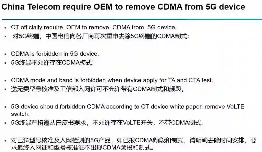 根据最新的消息,中国电信已明确要求从2020年起,所有5G终端不允许存在CDMA频段和制式,同时要求不允许存在VoLTE开关;如果已报CDMA频段和制式,需要明确去除时间安排,最终入网证和型号核准证不允许出现CDMA频段和制式。