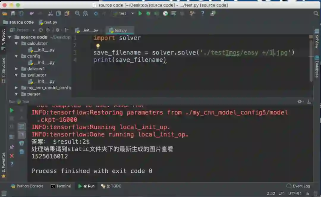 项目有一个 solver 的 Python package。里面的 solve 方法封装了整个系统。其功能是输入一张图片路径,将输出计算题识别过程和计算结果。