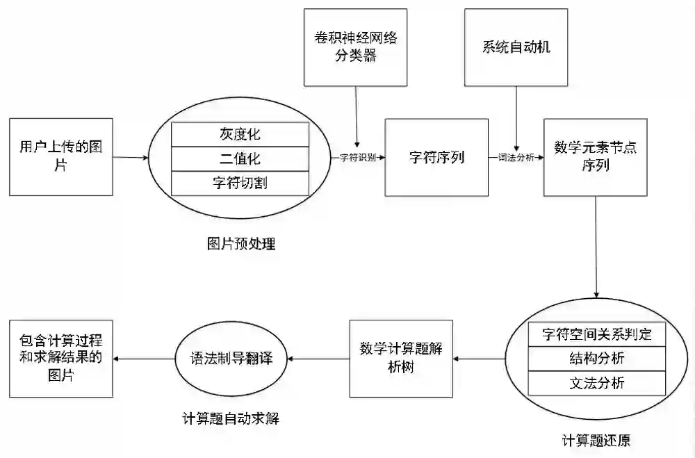 整个程序使用 Python 实现,具体处理流程包括了图像预处理、字符识别、数学公式识别、数学公式语义理解、结果输出。