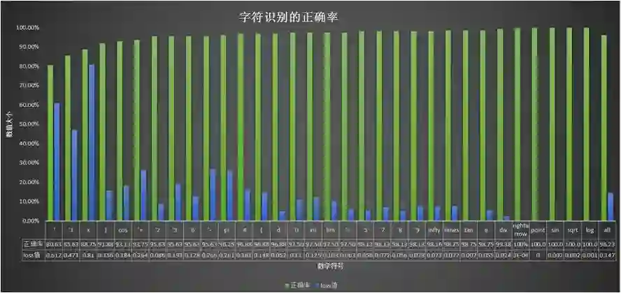 训练网络选用的数据集是国际数学公式识别比赛数据集(CROHME)。CROHME 数据集具有海量字符集图片,而且图片类型与实际输入非常相似。每种字符有 400 张图片,其中 60% 的图片用于训练,40% 的图片用于测试。