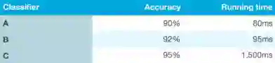通过上面表格中的例子,我们先预设一个可以接受的执行时间比如小于100毫秒,这个执行时间的衡量标准就可以作为我们的满意度指标。分类器的执行时间只要在这个标准下就可以了。在这里准确率是一个优化的指标,这是一个评价算法的非常有效又简便的衡量手段。