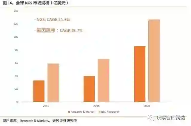 根据BBCReasearch和TransparencyMarketResearch的报告显示,2015年全球基因测序市场规模接近60亿美元,2016年超过了60亿美元,直逼70亿美元,预计2020年全球市场规模超过120亿美元,年复合增长率达到17-19%。