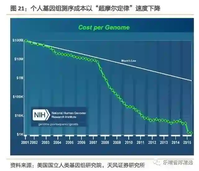 2001年,人类基因组工作草图的发表被认为是人类基因组计划成功的里程碑,平均每个人类基因组测序成本约为1亿美元。后来成本下降趋势基本符合著名的摩尔定律,到了2007年,每个人类基因组测序成本下降至1千万美元。