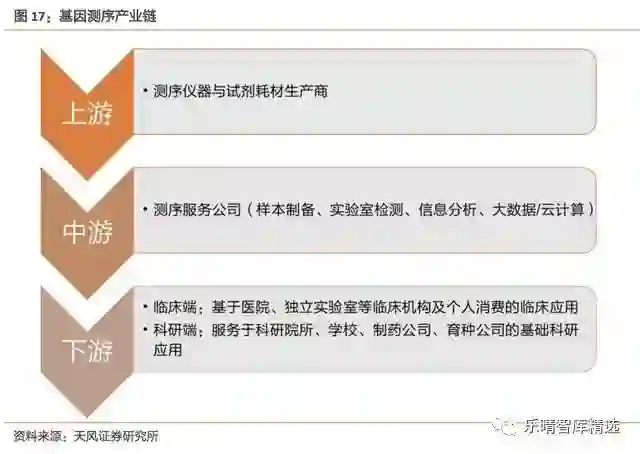 下游则分为两部分—科研和临床,测序技术首先是应用与科研端,后来逐步利用成熟流程切入临床端,目前的下游市场应用广泛,百花齐放。