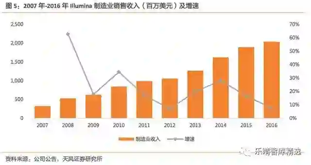 2017年初,Illumina市值约为240亿美金,2016年全年营收24亿美金,其中制造业约为20亿美金,测序仪和试剂耗材依然是Illumina的支柱业务。