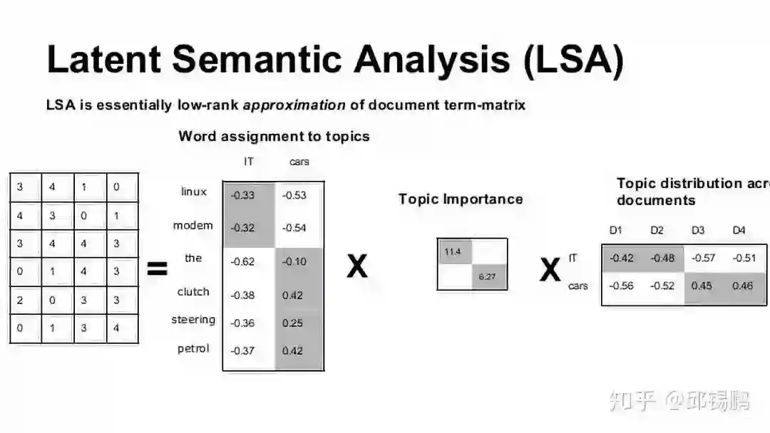 很有意思,每一列为一个文档的表示 ( BoW 向量 ),每一行为一个词的语义表示 ( 分布式假设,其中上下文是以文档为基本单位 )。这样我们就可以用