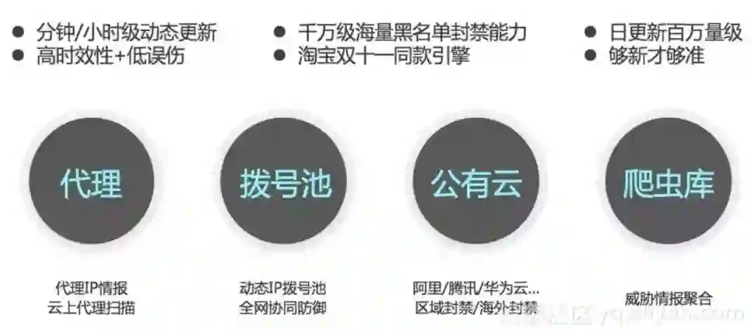 目前阿里云安全团队从云上流量分析出的各种类型的威胁情报库已经具备一定的规模,依据云平台强大的计算能力,可以依据历史一小时/一天/一周(场景不同)的流量情况计算,以应对快速变化的黑灰产资源池,这是我们防爬体系的另一个重要组成部分。