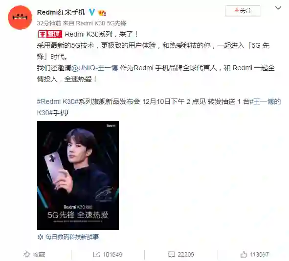 12月3日,红米Redmi手机官方微博宣布,王一博成为其品牌全球代言人。
