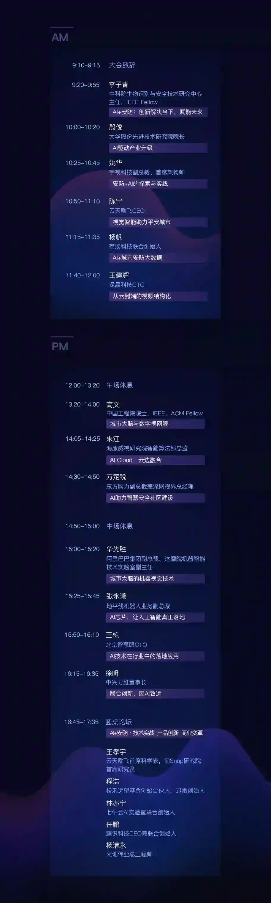 为了让参会者学到其他安防大会中难以了解到的专业知识与经验,17位演讲与圆桌嘉宾均为技术出身,平均每人有着17年以上的算法研究与工程开发经验,其中9位为名校人工智能博士学历。