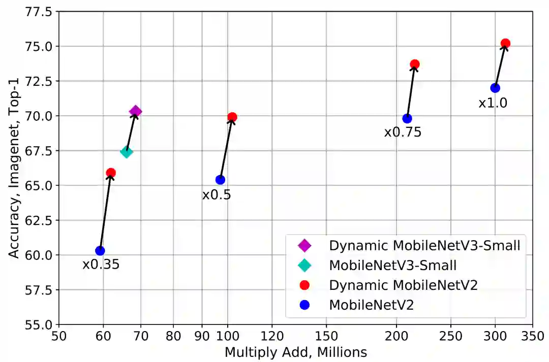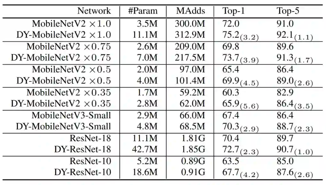 动态网络引入了两部分的额外计算:注意力模型和卷积核的叠加。注意力模型计算复杂度很低,由 avg pool 和两层全卷积组成。得益于小的内核尺寸,叠加多个卷积核在计算上也非常高效。因此,动态卷积引入的额外计算是非常少的。少量的额外计算与显著的表达能力的提升使得动态卷积非常适合轻量级的神经网络。