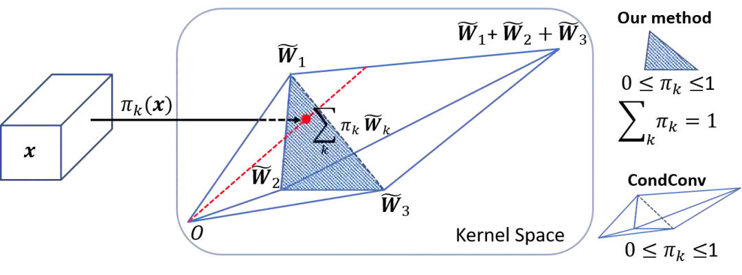 动态卷积网络的难点在于多个卷积核和注意力模型的共同学习。这个困难会随着网络深度的增加而增加。本文提出,解决这个问题有两个关键点。首先,限制注意力的取值将简化注意力模型的学习。注意力取值的限制将缩小多个卷积的叠加核的取值空间。文中将注意力取值限制在0与1之间,同时所有注意力的和为1。如图3所示,如果使用3个卷积核,注意力在0与1之间把叠加核限制在两个三棱锥中,注意力的和为1把叠加核进一步限制在以这三个卷积核为顶点的三角形中。对于这两个限制,softmax 是一个很自然的选择。