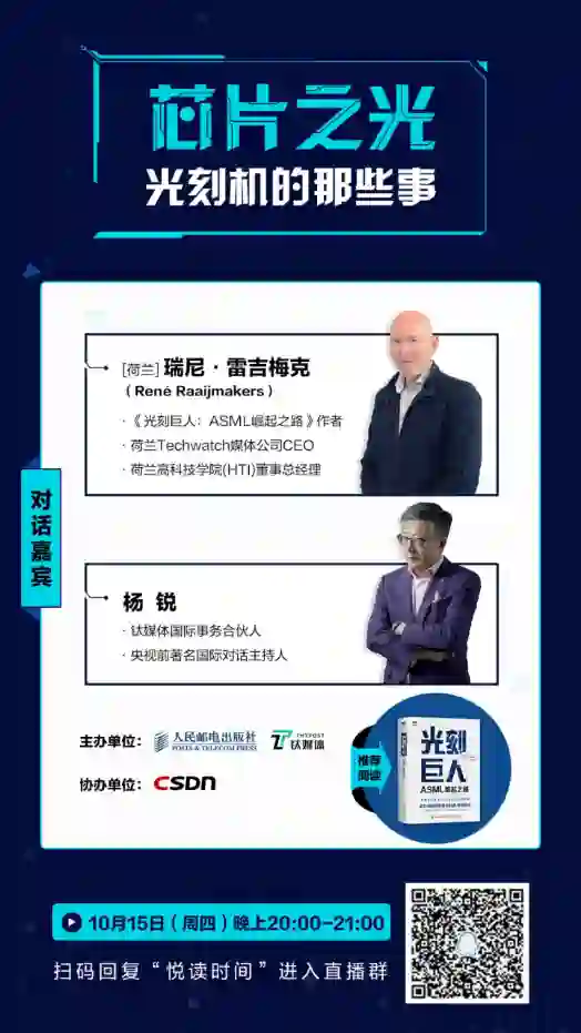 本期活动采用大咖对谈形式,邀请钛媒体国际事务合伙人、央视原著名国际对话主持人杨锐与《光刻巨人:ASML的崛起之路》作者、荷兰Techwatch媒体公司CEO、荷兰高科技学院董事总经理瑞尼·雷吉梅克,以ASML的企业故事为切入,围绕“芯片之光 光刻机的那些事”展开对话,独家分享芯片制造行业的制胜诀窍。