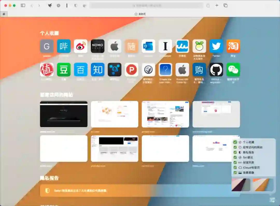 Safari 对起始页进行了重新设计,内容更加丰富:「个人收藏」栏目更加密集、经常访问的网站自动加载预览、显示其它设备中 Safari 打开的标签页等。