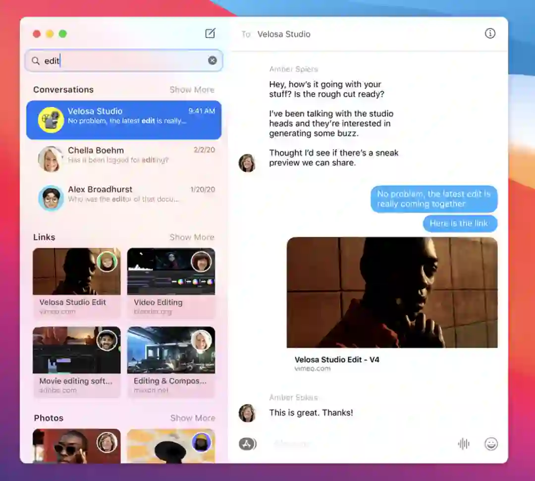 与 iOS / iPadOS 14 一样,信息应用支持了置顶会话、行内回复、设置群头像、提及他人等功能。搜索方面,新版信息 App 会根据会话、链接、照片等分类组织搜索结果,还会在搜索结果中高亮搜索词,方便我们快速找到想找的内容。