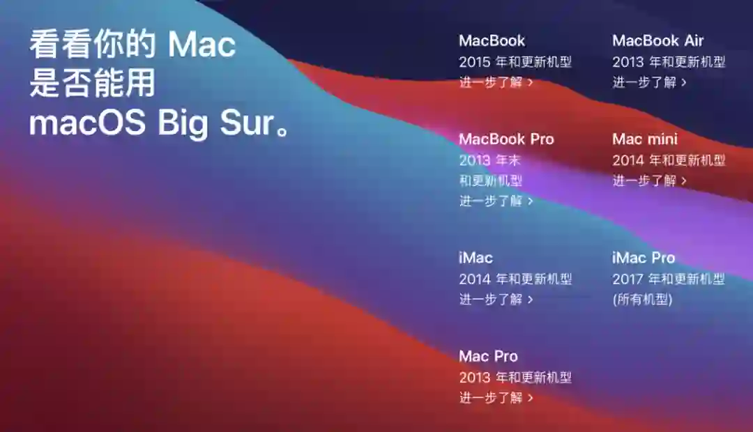 新系统对于 Mac 的要求方面,2013 年更新的 MacBook Air、MacBook Pro、Mac Pro 及之后设备可以升级 macOS Big Sur。