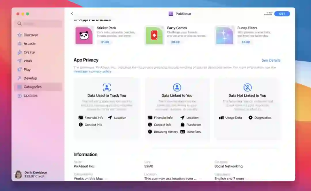 与移动平台类似,App Store 调整了应用信息的显示方式,在页面上方以独立的信息栏展示应用的开发者、支持语言、评分、大小等信息。根据官网介绍,App Store 还会以单独模块展示应用需要的权限、能够获取的用户隐私等,帮助我们更好地做出是否下载的决定。不过,目前还没有看到 App Store 中的相关隐私模块,该功能可能会在后续的版本更新中上线。
