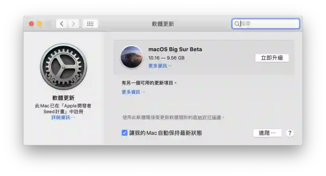 安装下载完成的安装包之后,就可以在系统设置中的「软件更新」选项中检测到 macOS Big Sur 的 Public Beta 升级了。