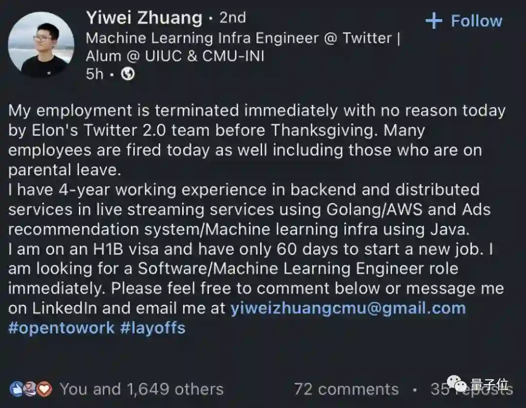 除了Ihara,还有一位工程师Yiwei Zhuang在领英上自述,自己无缘无故就被马斯克的推特2.0团队裁了。