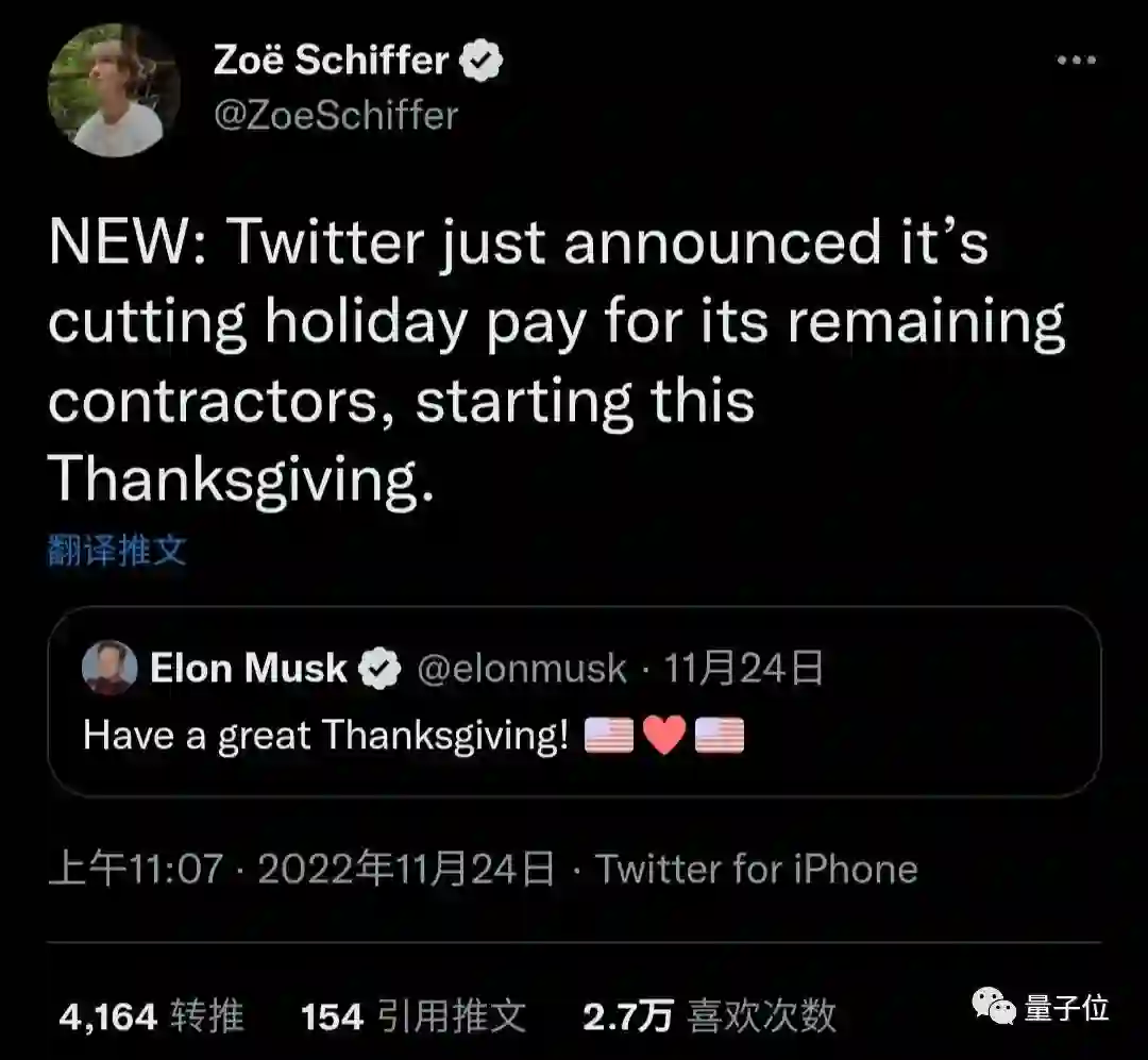 值得一提的是,就在感恩节当天,还有一项关于推特外包员工的政策开始实施了,那就是取消他们的假期工资。