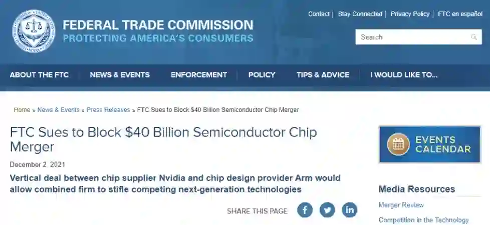 2021年12月,美国联邦贸易委员会(Federal Trade Commission)出手阻止,称这将使英伟达不合法地掌控计算技术和设计领域,导致竞争对手需要开发自己的芯片加以对抗。