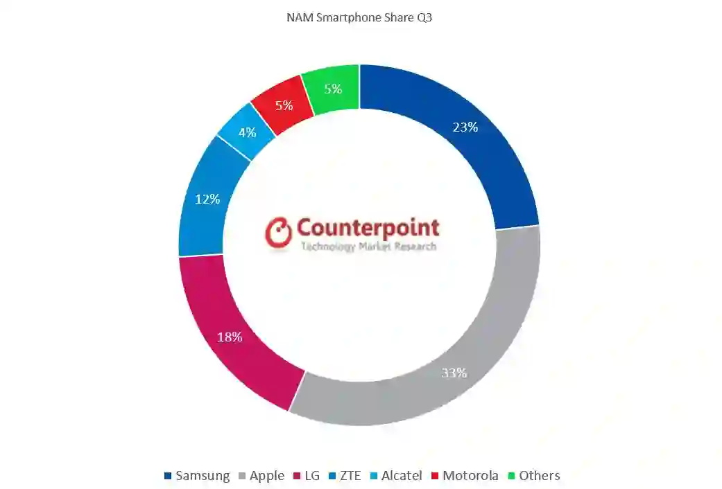 在美国,苹果市场份额比三星更多。LG竟然凭借18%的市场份额挤上了榜,而摩托罗拉在国外还是有一席之地的。