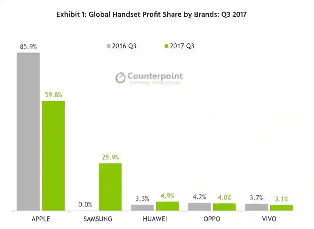 手机利润排名第二的依然是三星,不过三星是三季度的大赢家,Galaxy Note 8表现非常强势,三星的利润市场份额也达到了26%。