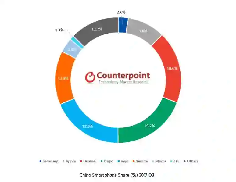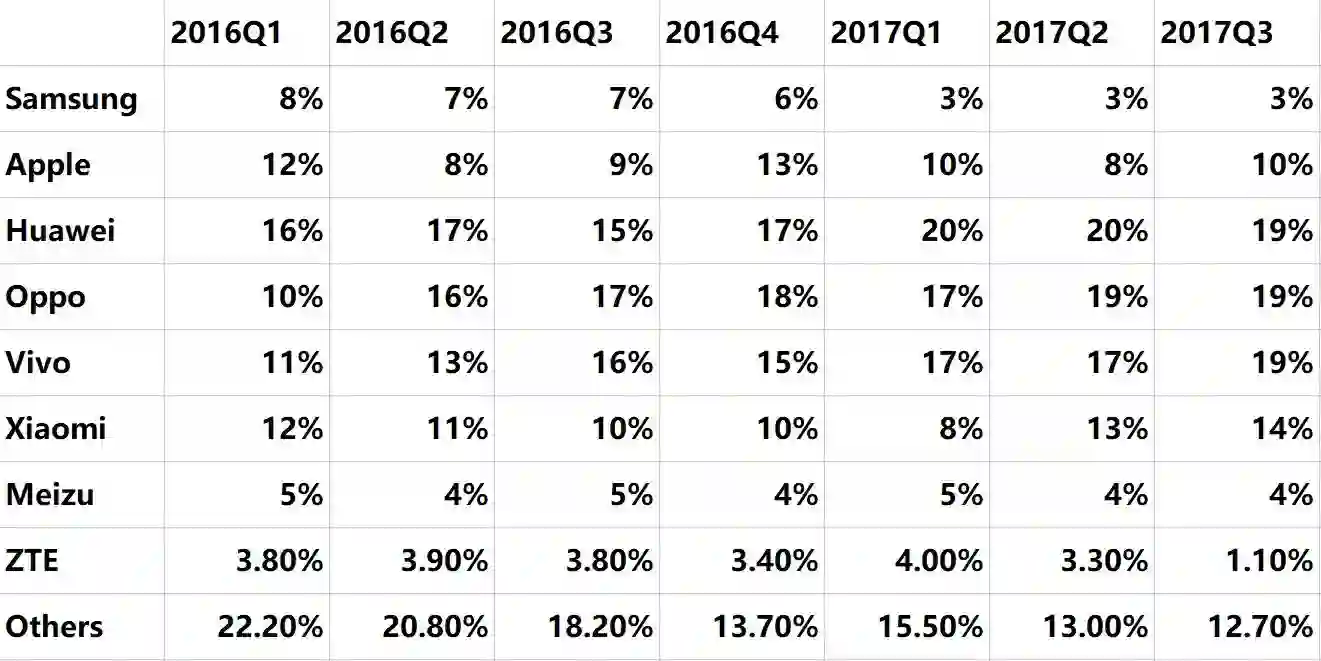整个2016到2017第三季度,国内的手机竞争十分激烈。从下图我们能看出,蓝绿大厂占据了近40%的国内市场,华为小米占据了30%,剩下的才由其它厂商分。三星竟然可怜到只有不到3%的份额,看来爆炸事件影响还是巨大的。