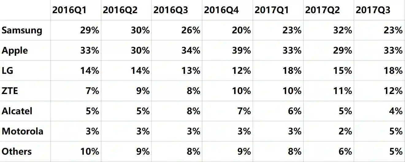 可以看出从2016第一季度到2017第三季度为止,中兴是唯一成功打入美国市场的中国品牌。