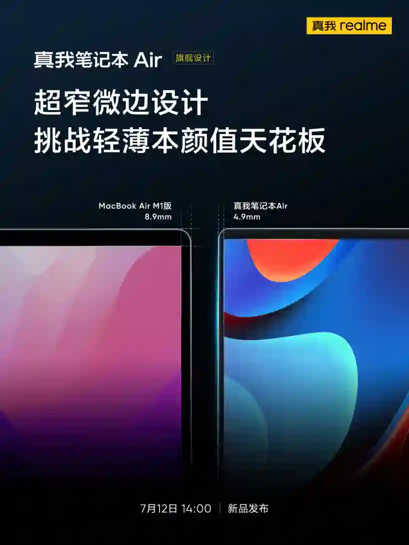 realme 官方今日宣布真我笔记本 Air 官宣将于 7 月 12 日 14:00 发布,号称配备 4.9mm 超窄微边屏。该笔记本在 A 面采用棋盘格设计,可以看到左侧的双 USB-C 接口、3.5mm 音频接口,右侧为双 USB-A 接口。这款真我笔记本 Air 预计将搭载英特尔第 12 代酷睿处理器,在与 realme 手机的生态配合方面也会有改进。另外,从海报可以看到,真我笔记本 Air 的左侧边框非常窄,预计屏幕显示将是该设备的一大卖点。
