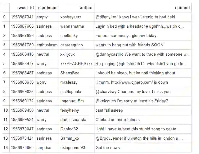 figure8_df = pd.read_csv("text_emotion.csv")figure8_df.head(15)