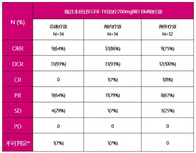在BLOOM研究剂量扩展阶段,未经EGFR-TKI治疗的脑转移队列AZD3759 200mg BID剂量组,纳入14例CNS可评估的脑转移患者,经确认的颅内ORR高达86%(12/14例),DCR达93%(13/14例),1例(7%)患者颅内病灶完全缓解(CR),11例(79%)患者颅内病灶部分缓解(PR),整体人群ORR达64%(9/14例),DCR高达93%(13/14例)。14例患者中有1例因在第一次影像学评估之前退出研究而疗效不可判定,在13例可判定疗效人群中,AZD3759颅内ORR高达92%(12/13例),DCR高达100%(13/13例),是目前颅内有效率和疾病控制率最高的EGFR-TKI。