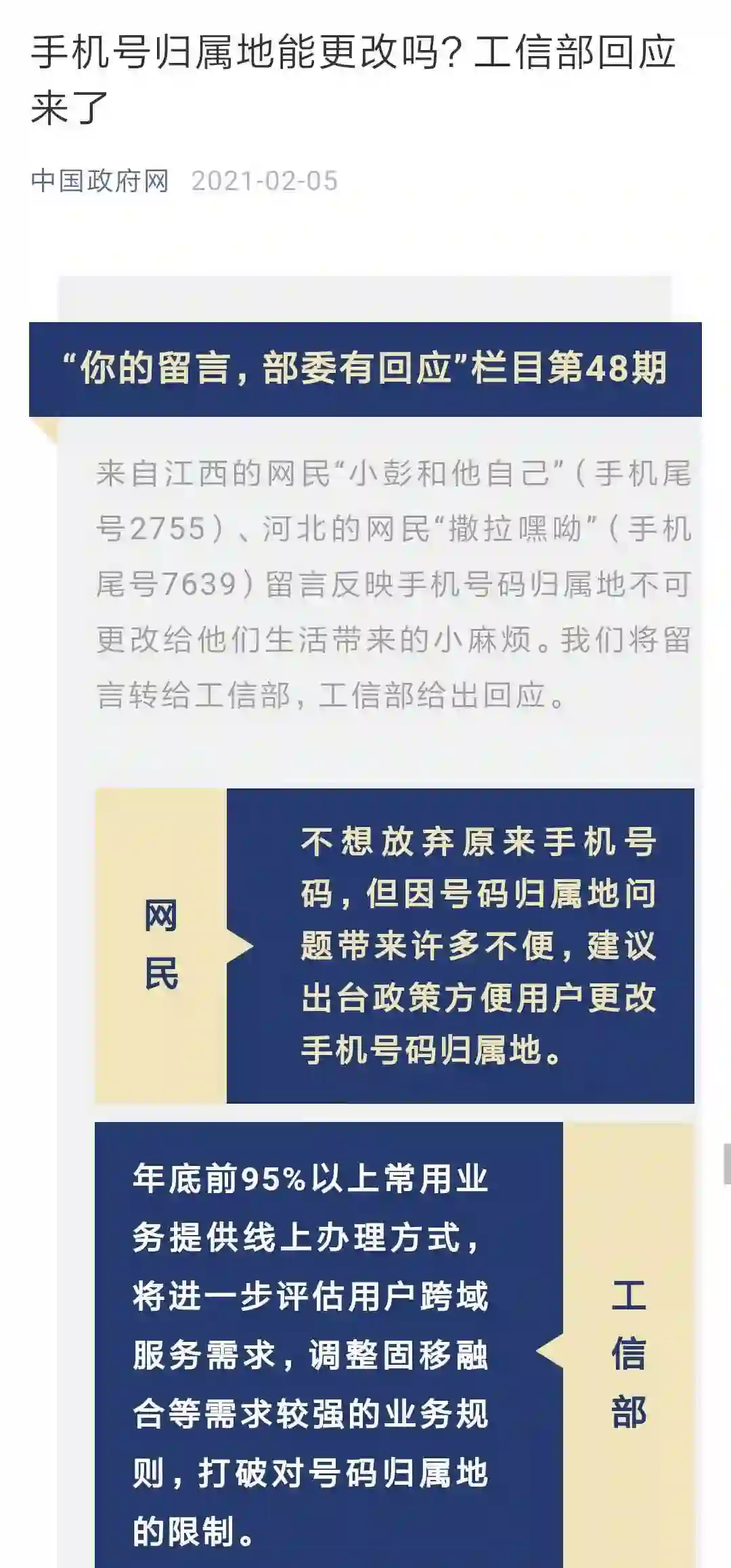 【工信部回应手机号归属地能否更改】据中国政府网公众号消息,对于网友“手机号归属地能更改吗”的问题,工信部近日回应称,目前,我国已取消移动长途及漫游费,用户的通信资费和用户所处的地理位置(限国内)无关。根据行业建设要求,今年年底前95%以上常用业务应提供线上办理方式,亲情网等业务也取消了号码归属地的限制,可以实现跨域号码绑定,基本能满足跨域流动用户的业务办理需求。下一步,工信部将进一步评估广大用户对跨域服务的需求,调整固移融合等需求较强的业务规则,打破对号码归属地的限制。