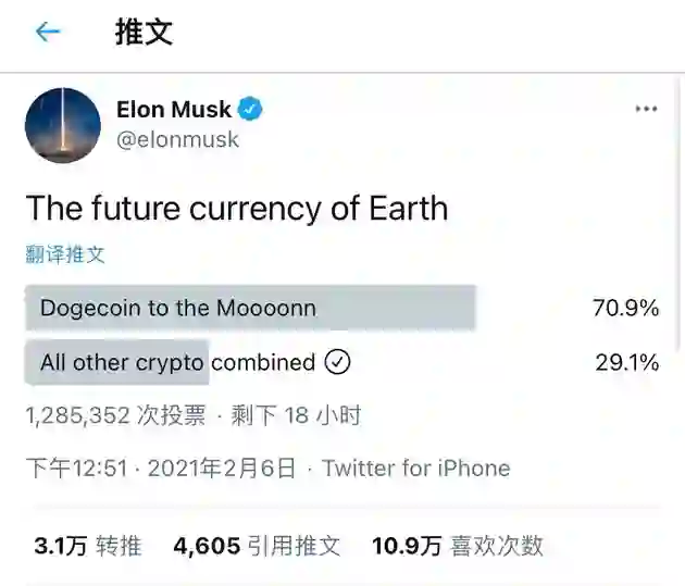 【马斯克发起投票:超70%网友选择狗狗币为未来货币】