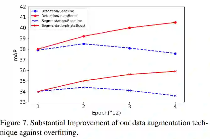 从鲁棒性的角度来看,传统的 Mask R-CNN 的框架,在训练到 24 个 Epoch 的时候,出现比较严重的过拟合现象,精度开始下降。使用 InstaBoost 之后,模型在 48 个 Epoch 之后精度仍然呈上升趋势。说明 InstaBoost 很大程度上提升了分割框架的鲁棒性。